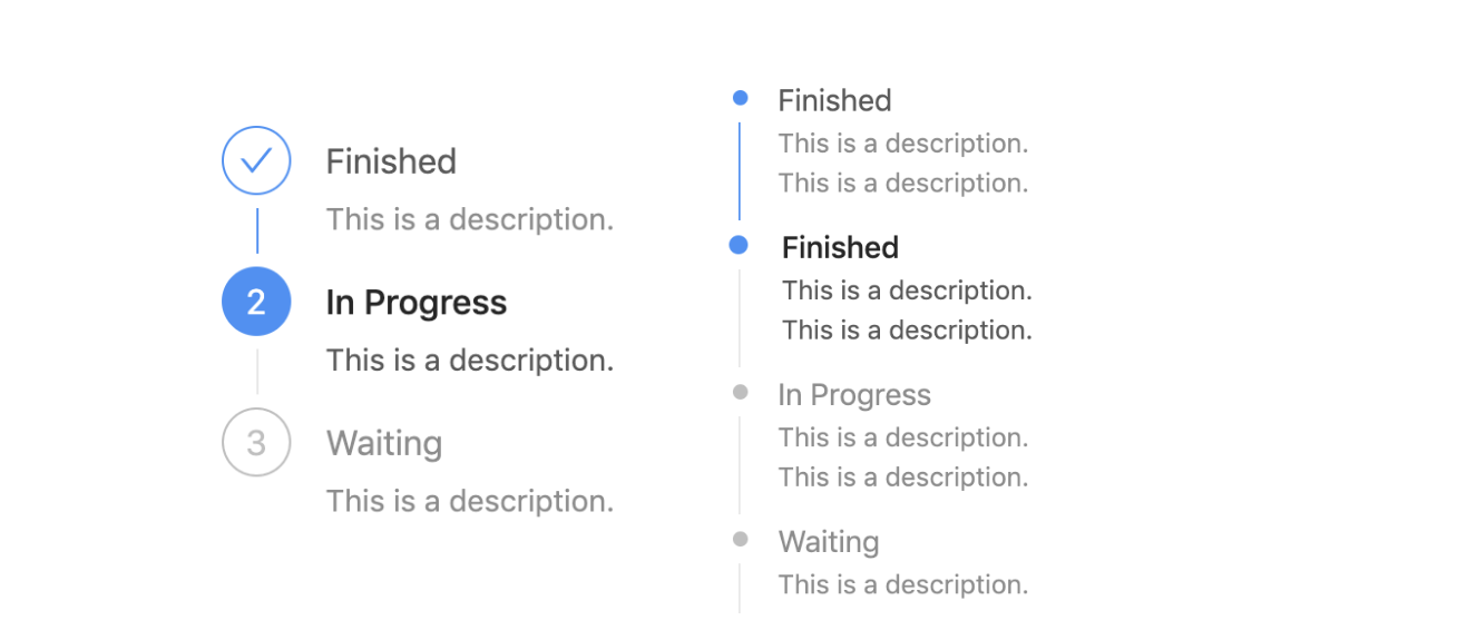 优点:较于横向步骤组件,纵向步骤组件分步数量可以更多。左右布局的信息展示方式允许单步骤下容纳更多的信息。不会造成横向步骤和纵向信息一直延续无结束的感觉。